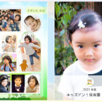 小さかったころの写真と現在の写真を並べることにより、その成長を楽しめる「赤ちゃんと年長写真」。文集ページや卒園生一同紹介ページに良く採用されます。