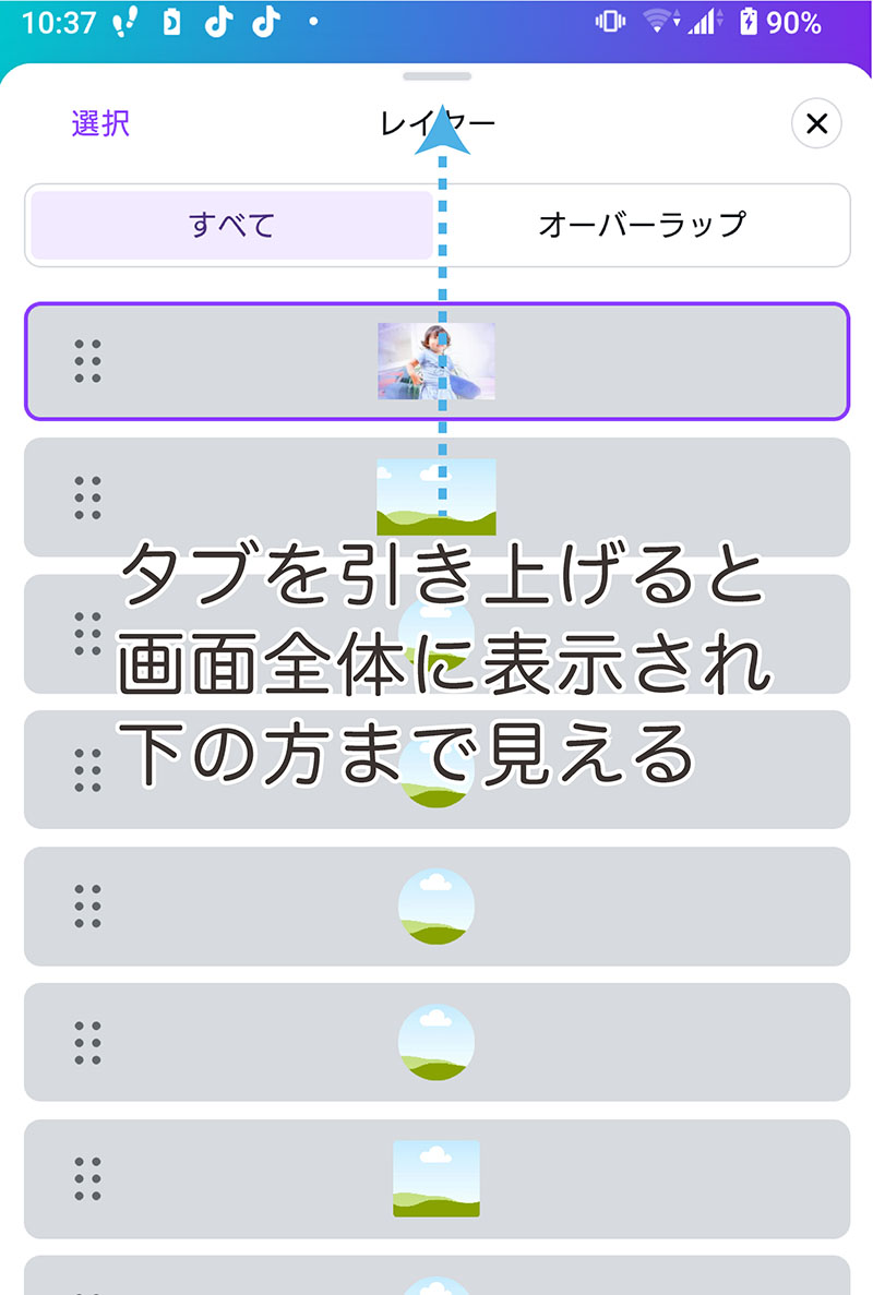 3.写真の重なり順が表示されますので、表示部分をスワイプして「一番下」まで降りていってください