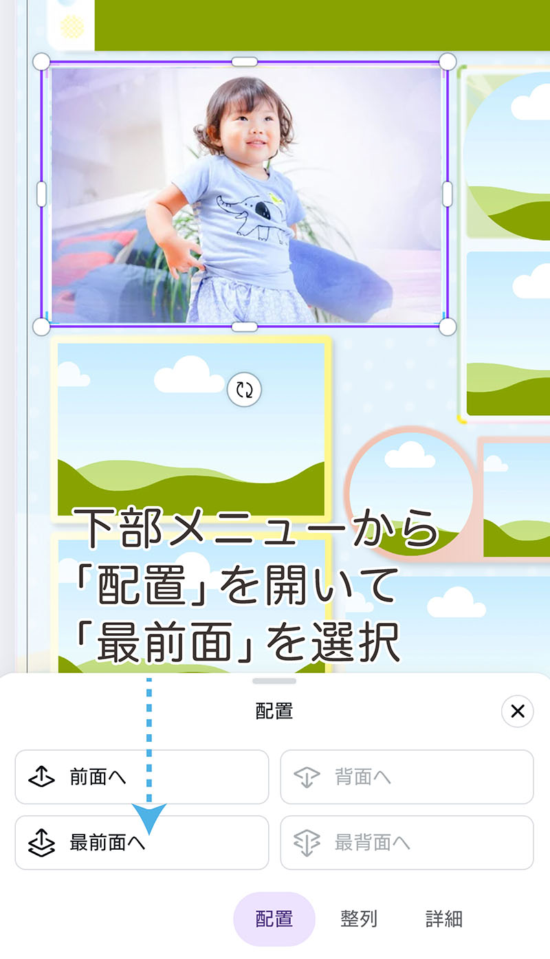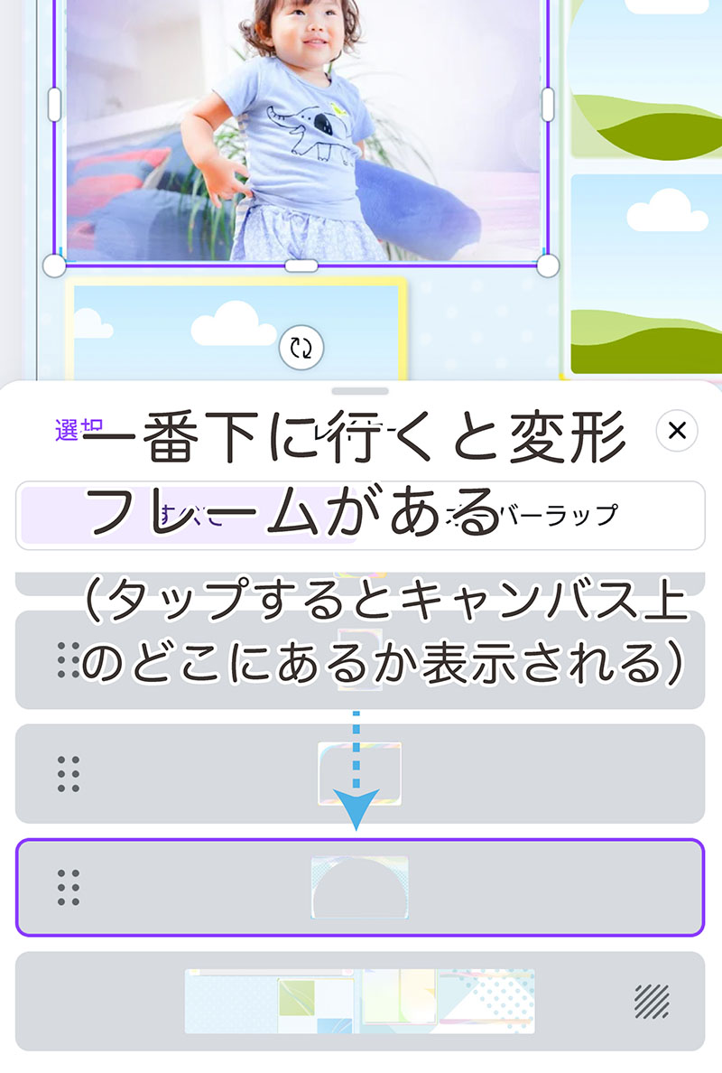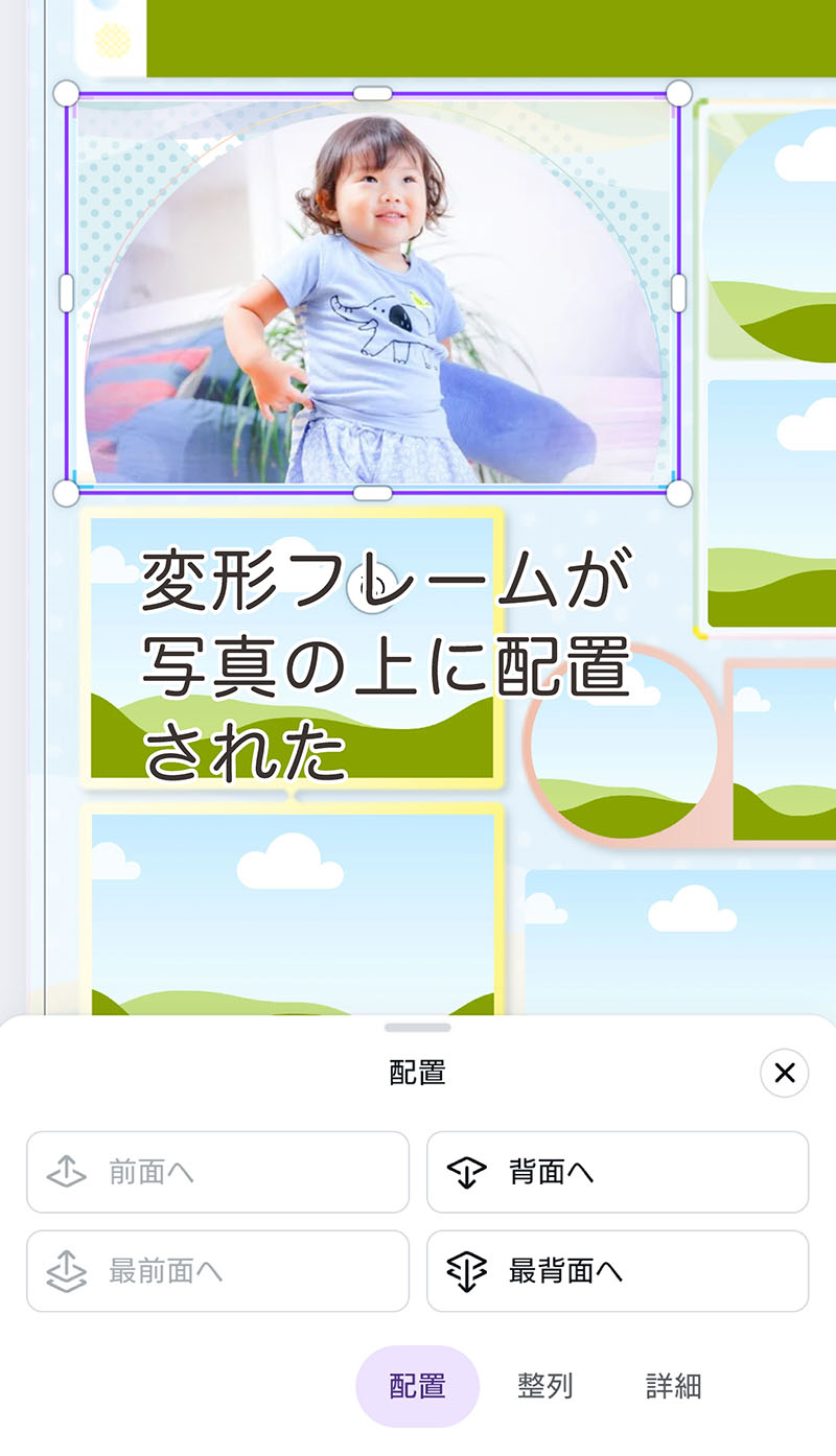 リストでは「写真の前面にフレームが位置」していますが、実際にキャンバを開くと「写真の背面に位置」しています。