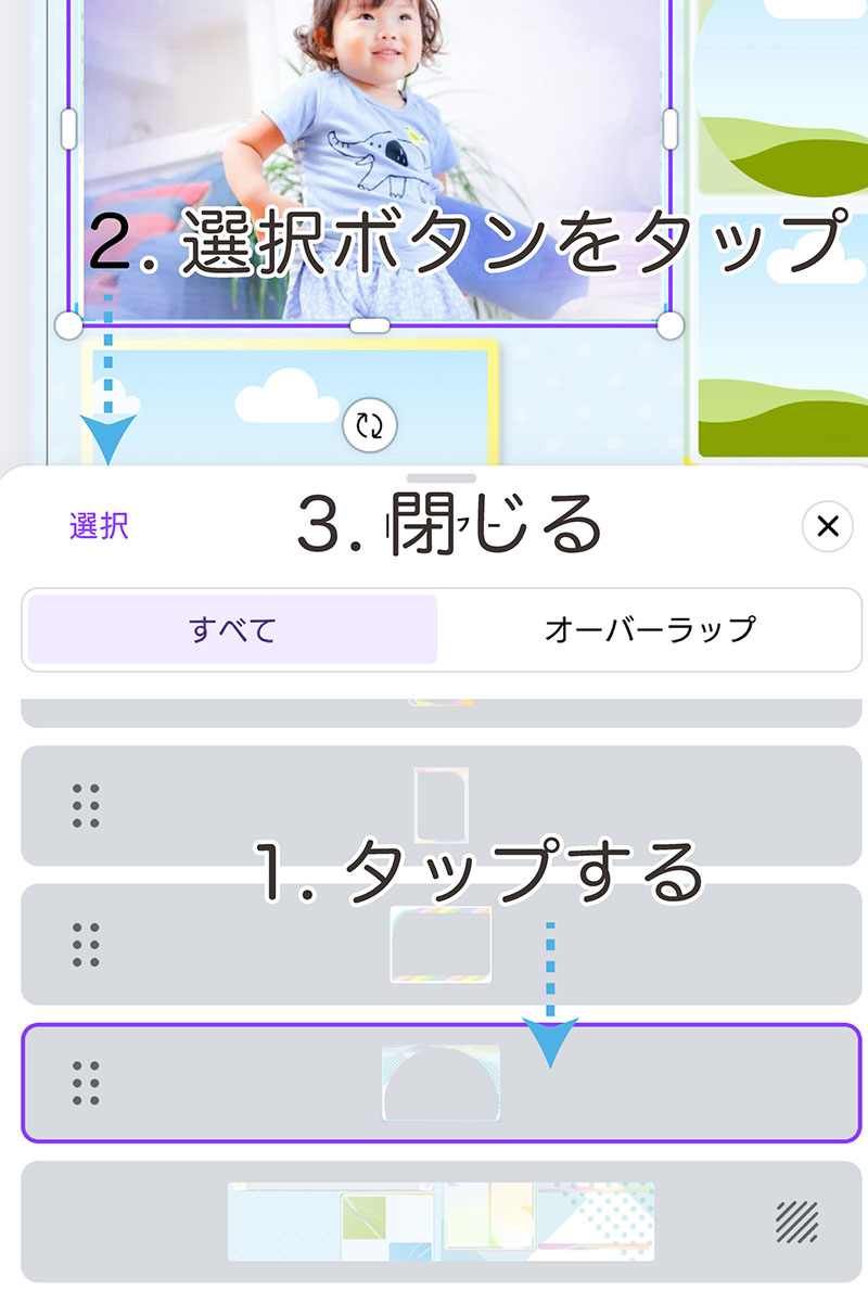 6.該当の変形フレームを見つけたら、それをタップした後「表示部分の左上にある“選択”」をタップします。