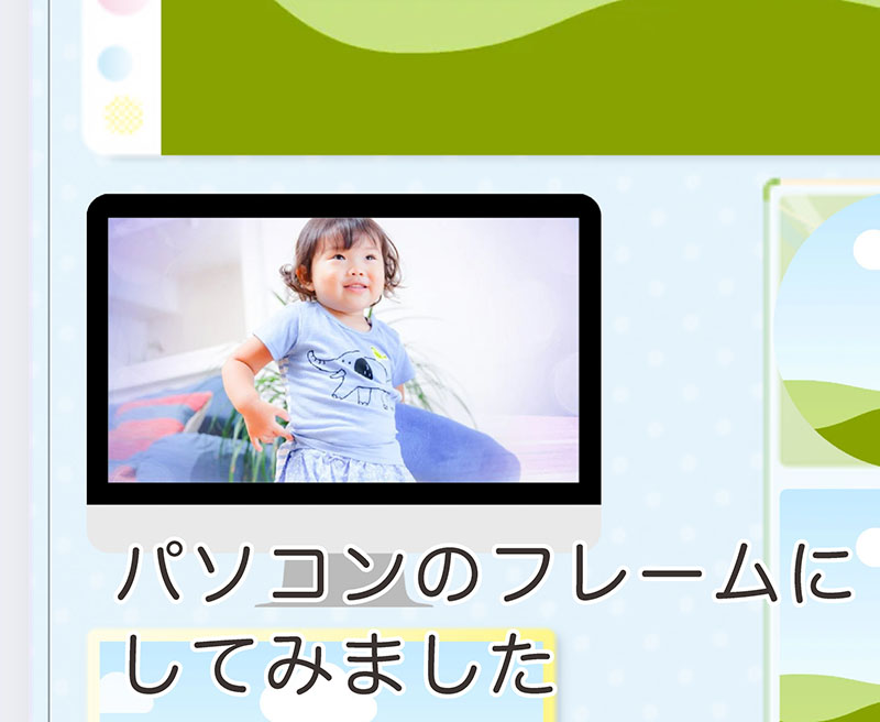 上の写真は変形フレームと写真が吸着する“グリッド”を「削除」で消し、新たにパソコンに見立てたフレームを配置したものです。