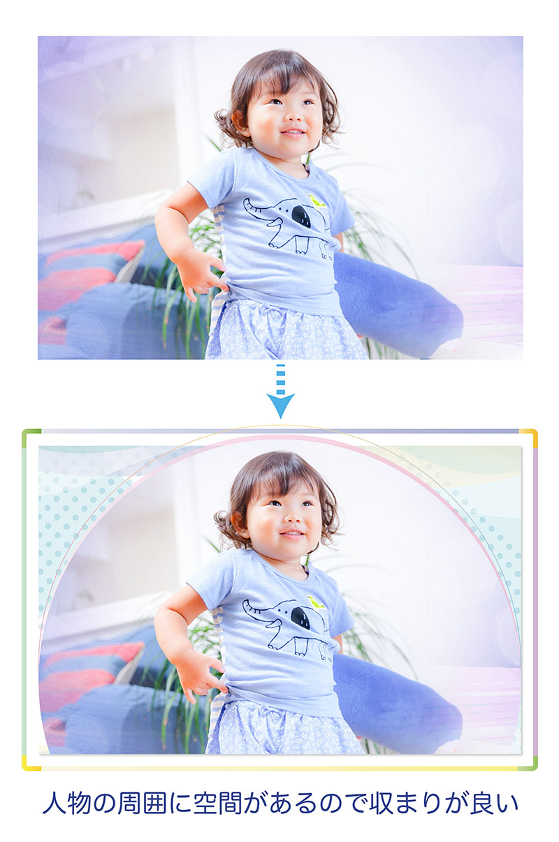 変形フレームは、その形状から「写真の一部を削る形」で表示されます。