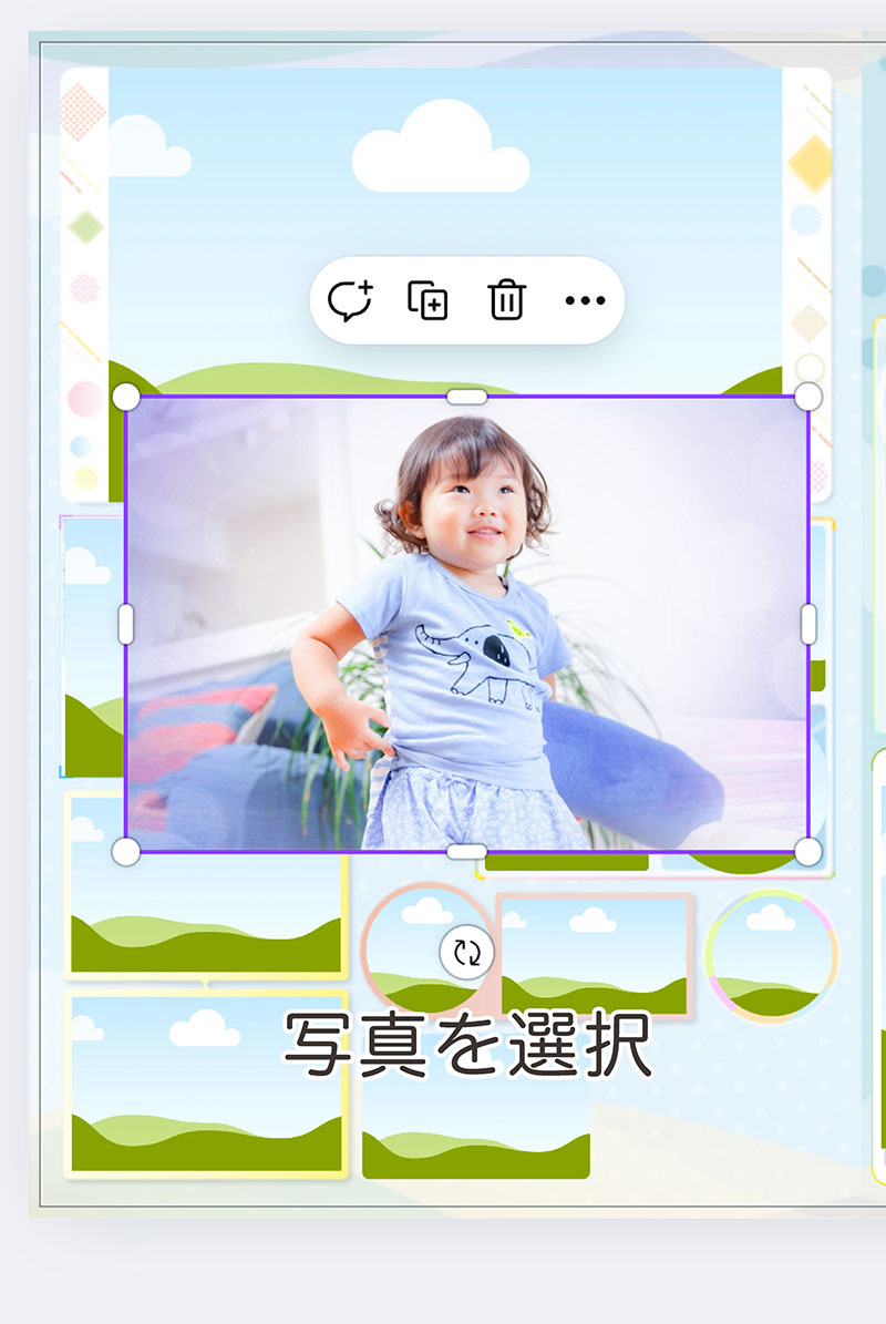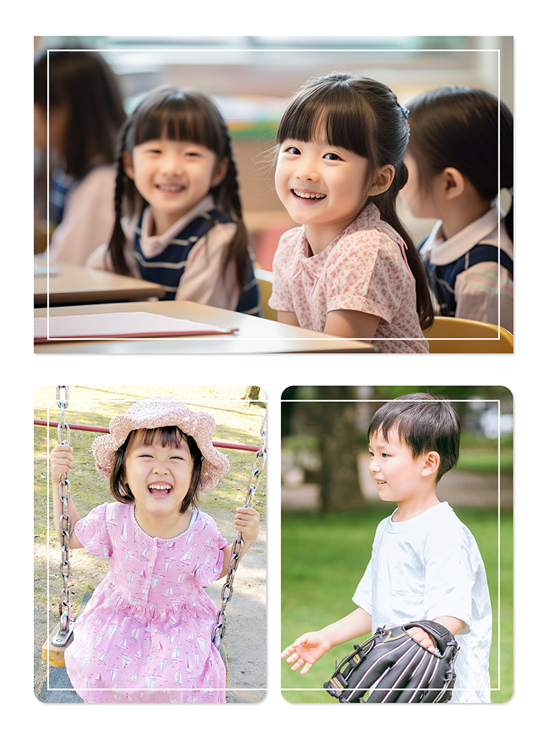 雲型や一部がカットされた「変形フレーム」は、四角や丸といった単調な形状で並ぶ卒園アルバムページに、かわいらしさや華やかさを添えます。