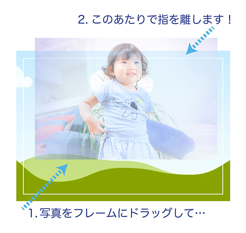 - 3.(重要!)写真を「中央」ではなく「白線より外側のはじっこ部分」にドラッグの指を位置させる